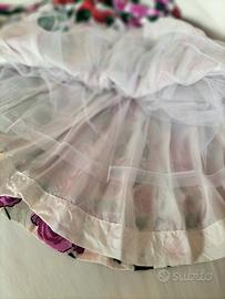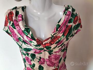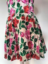 Abito midi estivo a fiori cerimonia cocktail originale vintage anni 50 , scollatura drappeggiata, fatto a mano , in rado di seta fiorito , rose rosse e rosa e foglie verdi su fondo bianco perla, sottogonna in tulle bianco. Taglia 42 IT. Nessun difetto ottimo stato vintage