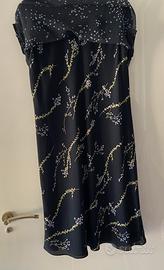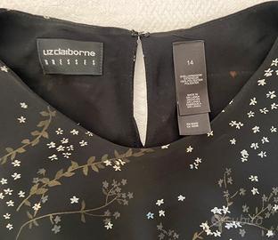 Vendo raffinato abito midi di Liz Claiborne DRESSES, ideale per occasioni speciali, serate fuori o anche per l'ufficio. Realizzato con un tessuto leggero e fluente in poliestere, questo vestito presenta una graziosa stampa floreale con rametti e piccoli fiori bianchi e oro su una base blu.