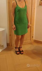Abito con collo sciallato sul davanti e profondo scollo dietro, ornato con catenina dorata che incornicia lo scollo. Sottoveste abbinata.