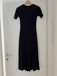 Vendo abito midi firmato Zara, colore blu scuro, realizzato in morbida maglia a costine. Grazie alla sua composizione prevalentemente in cotone, è un capo fresco, traspirante e perfetto per la mezza stagione. La linea è aderente ma elastica, valorizzando la silhouette con semplicità.