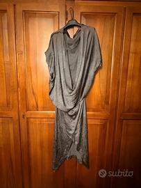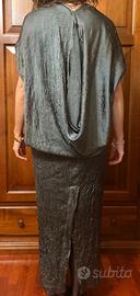 Abito midi Zara dalla silhouette rilassata e drappeggiata, soprattutto nel corpetto, con una profonda scollatura a V sulla schiena, che può essere ridotta con un bottone.