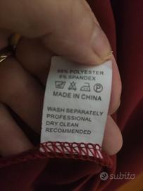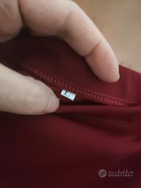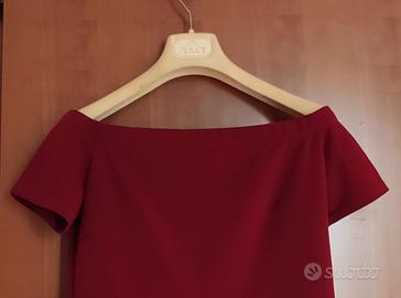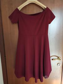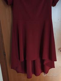 Abito elegante, bordeaux, a mezze maniche, con fondo asimmetrico, mini sul davanti (40cm dalla vita) e lungo dietro ( 64 cm dalla vita); scollo a barchetta con spalle scoperte;