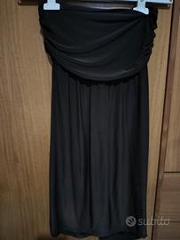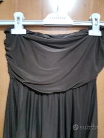 Abito marrone dallo stile unico, con taglio morbido e tessuto fluido che cade elegante sul corpo. Modello senza spalline con fascia elasticizzata sul busto, perfetta per una vestibilità comoda e femminile.