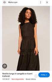 Abito smanicato a marchio Motivi realizzato in cotone pizzo Sangallo con bellissimo motivo a balze e rouches su giromanica, pregiati intarsi sulla gonna, colore moka, nuovo, ottima vestibilità.