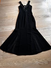 Abito Benetton nero con dettagli in voile sul fondo, viscosa, lungo. Taglia M. Decori sullo scollo, zip per maggior agio nell’indosso, taglio spiego del tessuto che cade senza stringere ne’ segnare.
