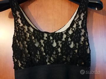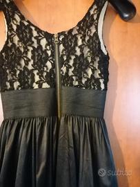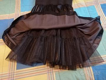 Elegante abito nero smanicato con corpetto in pizzo, fascia in vita, chiusura sul retro in zip e sottogonna in tulle.