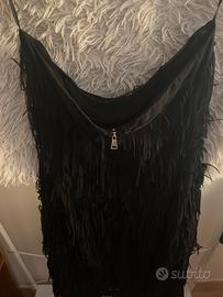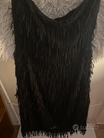 Foderato cerniera sul didietro lunghezza sopra il ginocchio, abito usato una volta, vestibilità aderente, abito nero con frange