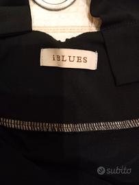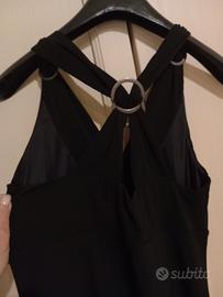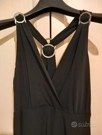 Abito nero lungo al polpaccio, marca IBlues con bretelle incrociate nella parte retrostante e impreziosito da tre anelli.