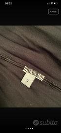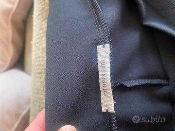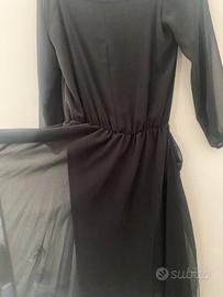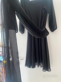 Abito elegante da donna di colore nero, taglia S, dal design femminile e raffinato. •Modello: abito corto / midi leggero con linea fluida •Scollo: ampio e morbido, stile barca/drappeggiato •Maniche: lunghe in tessuto trasparente con elastico al polso •Vita: leggermente arricciata con elastico → valorizza la silhouette •Gonna: ampia e morbida con movimento, lunghezza asimmetrica •Dettaglio: presenza di una stola/cintura lunga nello stesso tessuto, utilizzabile in diversi modi