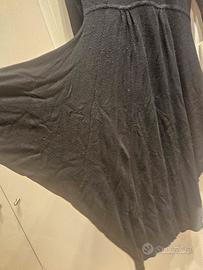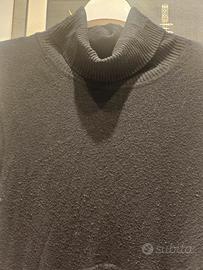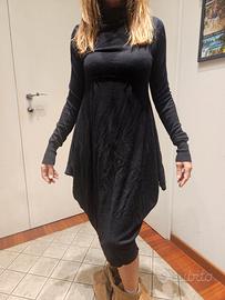 Abito donna nero in maglia invernale, manica lunga, lunghezza al ginocchio, con polzino alle maniche e in fondo, collo alto, dai fianchi al ginocchio si allarga lateralmente. Un motivo molto particolare che può essere però indossato anche per andare in ufficio. Un capo caldo e portabile, è una taglia unica ma essendo in maglia si adatta bene al fisico , sia alla S che alla M. Marca Bu.Go.