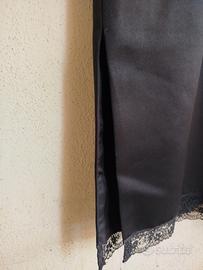 Splendido abito elegante nero,adatto per ogni occasione con inserti in pizzo, avvitato, scollatura con pizzo,spacchi laterali,lampo laterale. Comprato in Canada marca Odessa, taglia americana 2 Uk corrispondente alla taglia 40. Tessuto in poliestere ma è uguale al Mikado. Mai indossato.