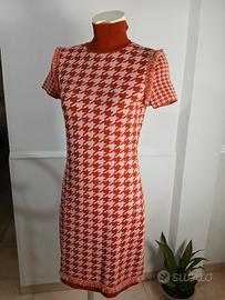 Abito Blumarine in maglia aderente nei toni del rosso è rosa cipria.Presenta un collo alto e maniche corte con dettagli volant sfrangiati.