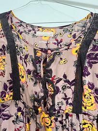 Vendo delizioso abitino Odd Molly originale, caratterizzato da una splendida stampa floreale su base color rosa antico/tortora. Un capo ricco di dettagli, perfetto per chi ama lo stile gipsy e ricercato. • Maniche a 3/4 con polsino a volant. • Punto vita segnato da un elastico morbido e nastri in gros-grain nero da annodare lateralmente o dietro. • Orlo interno rifinito con una contrastante fantasia etnica sui toni dell’arancio. • Taglia 38-40 • Condizioni: come nuovo. • Stile: Può essere indossato come mini-abito o sopra dei jeans skinny o leggings.