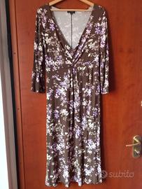 abito OVS verde scuro/ marrone con fiori glicine, rosa e panna. Scollo a V. Maniche 3/4. 96% viscosa, 4% elastane.