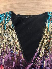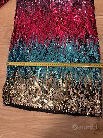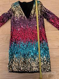 • Tessuto e Decorazione: Il vestito è interamente ricoperto di paillettes lucide, che creano un effetto luminoso e dinamico.