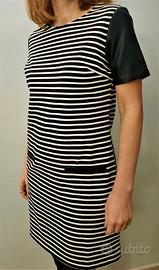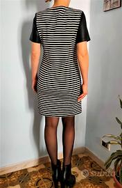 Abito a righe orizzontale bianche e nere. Abito Camaieu, nuovo mai indossato. Taglia 46 = FR(42). Tessuto: 77% Poliestere, 21% Viscose, 2% Elastin . Le tasche sono finte. Le maniche sono di semi pelle.