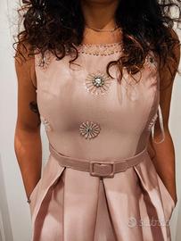 Applicazioni e ricami sul décolleté, cinturino in vita, tasche laterali.