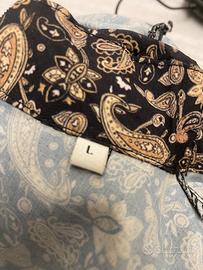 Abito fantasia, collo coreana, con scollo davanti a goccia, manica lunga, svasata con frange, usato poco