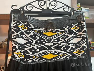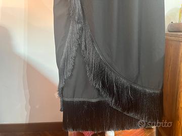 Abito lungo Patrizia Pepe, mai indossato, taglia USA 1, corpetto superiore in fantasia bianco e giallo su fondo nero, gonna nera con spacco davanti con frange presenti anche sul fondo, tessuto viscosa