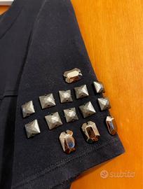 Vestito in cotone grosso, color blu scuro con borchiette sulle spalle. Zip laterale e gonna leggermente a balze. Utilizzato un paio di volte