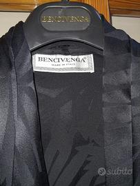 Vestito per cerimonia calibrato in PURA SETA color nero con stampe dello stesso colore di una nota Atelier di Grumo Nevano ( NA ). TG. 54 Giacca spolverino con collo sciallato Gonna tubino foderata L. 71 Camicia grigio – nero Con fiori, abbottonata sul lato sinistro.