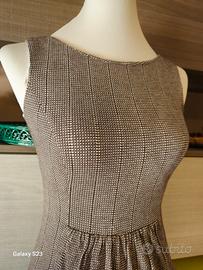 Abito Prada, elegante linea avvitata con tasche a filo e leggero drappeggio anteriore. Fantasia vichy marrone e bianco. Taglia 38, etichetta interna tagliata. Condizioni perfette