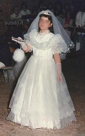 Vestito molto bello, utilizzato una sola volta. Realizzato da una modista, in organza in seta con leggeri ricami a forma di fogliolina. È ampio e lungo ed è ideale, oltre che per una comunione, per una damigella di un matrimonio. Chi lo acquista riceverà in regalo anche il velo e la coroncina in strass visibili nella foto. Adatto ad una bambina di 9-10 anni.