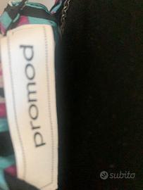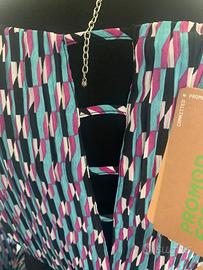 In tessuto ecologico, fantaia geotermica nei colori rosa nero e azzurro. Taglio regolare con maniche leggermente svasate. Scollo a V poco profondo sulla schiena. Nuovo con cartellino, ottimo anche come idea regalo.