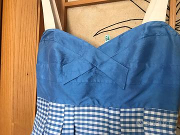 Abito in pura seta effetto cady con spalline larghe, corpetto alto. Tasche a filo. Fantasia Vichy nei toni crema e azzurro lungo al ginocchio