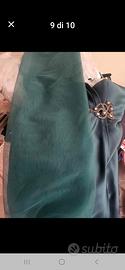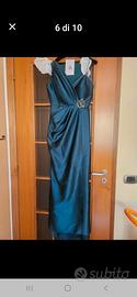 Vendo raffinato ed elegante abito firmato "Impero ",colore titanio,con apertura davanti, bretelline di strassini e piccolo drappeggio laterale con bellissima spilla, acquistato in un noto atelier al costo di €430 e indossato solo una volta.L'abito è completo di coprispalle stesso colore e custodia originale .