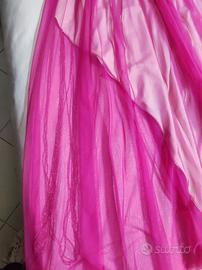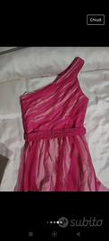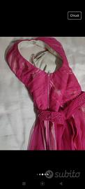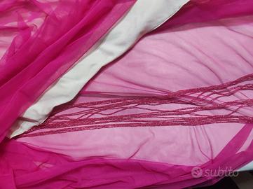 abito Relish fucsia in tulle , con spacco asimmetrico sulla destra (sottolineato da una frangia lunga di corallini),e cintura impreziosita da un ricamo di corallini,taglia 44,H tot 150,vita 74,seno 90