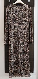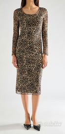 Bellissimo abito in tessuto elasticizzato, vestibilità aderente che esalta le forme del corpo, fantasia animalier leopardata, scollo rotondo, manica lunga. Mai indossato, con cartellino.