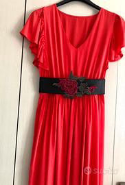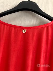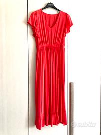 Vestito marca originale RINASCIMENTO. Scollo a V con ruches sul fondo e sulle maniche. Elastico in vita, possibilità di usarlo con o senza cintura. Colore ROSSO acceso. Nuovo, usato una volta. Taglia S