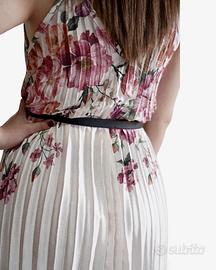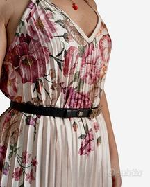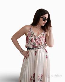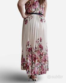 Abito lungo plissè a fiori Rosa effetto satin . adatto a tutte . Molto comodo, adatto sia di giorno che di sera per una cerimonia . Senza chiusura . Veste da una S fino a una XL . 100% poliestere