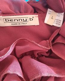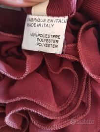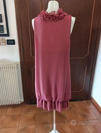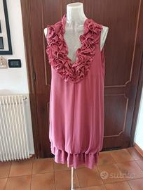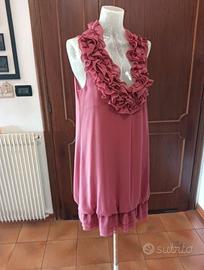 Elegante abito rosa antico con profonda scollatura a V impreziosita da voluminose rouches e da un fondo a palloncino. L'abito è foderato ed è in perfette condizioni. Taglia L. Ascelle cm 45. Lunghezza cm 85.