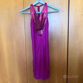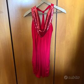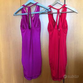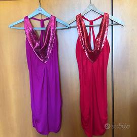 Abito rosa ciclamino/violetto ed uno rosso, estivi taglia M in maglina con zona davanti in alto con payette, ai lati in fondo è un pò arricciato tipo drappeggio. Usati poco, sono stati un pò di tempo chiusi in un baule. Guarda le foto, € 8 l'uno, si possono prendere tutti e due con un'unica spedizione, valuto offerte per tutti e due.