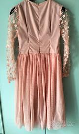 un abito rosa con le maniche trasparenti con decorazioni floreali e brillantinato