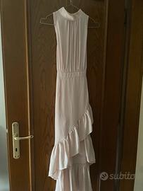 Elastico in vita con la cintura che si può chiudere sia sul davanti che sul di dietro. Abito lungo con le rouge che si apre
