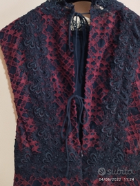 Vendo abito Sandro, Paris, in tessuto di lana con inserti di pizzo e organza plissé, colore avion/ciclamino. Manica corta, chiusura posteriore con laccetti .. taglia 38 IT. Nuovo mai indossato