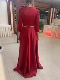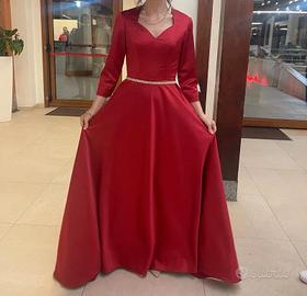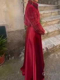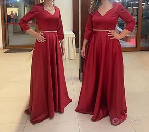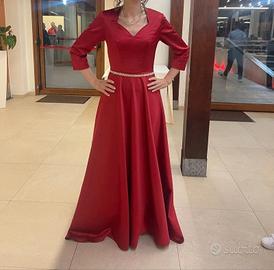Sartoria italiana. Splendido abito lungo color bordeaux. In tessuto duches (rasone) Gonna ampia e fluida.Coda nella parte posteriore. Scollo a cuore. Maniche 3/4 Punto vita valorizzato con cinturino decorativo disponibile a parte. Colore bordeaux intenso, molto raffinato 📏 Taglia: S, disponible anche M 📦 Condizioni: ottime (indossato una volta/ come nuovo). Perfetto per chi cerca un abito elegante e originale senza spendere una fortuna.