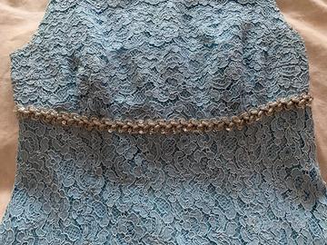 Abito sartoriale di un delicato colore azzurro pastello, interamente realizzato in pizzo con motivo floreale. E' un abito vintage senza maniche, con scollo a barchetta e con silhouette svasata, che arriva al ginocchio. Sottoseno è applicatata una decorazione color argento. Perfetto per cerimonia e cocktail party. Nelle foto sono riportate le misure esatte. La taglia corrisponde ad una 44/46 italiana