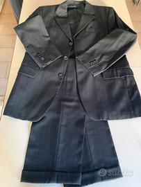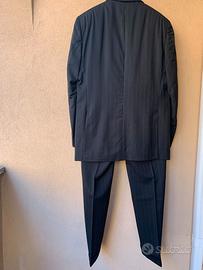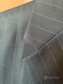 Bellissimo completo classico nero gessato con sottili righe azzurre e bordeaux, realizzato con tessuto pregiato del lanificio Angelico di Biella (made in Italy). Giacca taglio classico con 3 bottoni, 3 tasche esterne e 4 interne (di cui una piccolissima) con doppio spacco laterale. Pantalone con risvolto e 1 pince Tessuto 100% Lana di Tasmania (Super 100's), una fibra merino australiana molto fine e pregiata. Taglia 52 NR Misure: Giacca: spalle 48 cm- circonferenza torace 114 cm- lunghezza 80 cm. Pantalone: circonferenza 93 cm- lunghezza dal cavallo 82 cm-lunghezza dalla cintura 109 cm Indossato poche volte, ideale per cerimonie ed eventi speciali. Vendo per cambio taglia. Solo se interessati non esitate a contattarmi.
