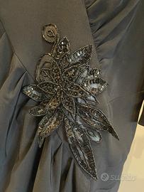 Stupendo abito vintage anni 70/80, produzione sartoriale, in seta, con drappeggi e applicazioni di perline e paillettes. Bellissime le maniche. Chiusura laterale con cerniera.