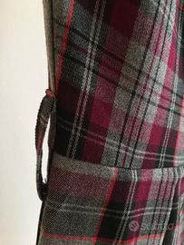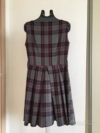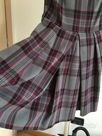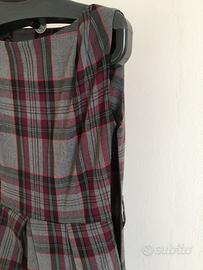 Abito senza maniche in tessuto morbido ma denso, adatto per autunno inverno, fantasia scozzese, a quadri. Comodo e versatile. L'abito è composto da un top aderente con scollo a barca, piccole pieghe sul davanti e una gonna con bellissime contropieghe sul davanti e sul retro: una centrale profonda e due più piccole. Chiusura laterale con cerniera, passanti per cintura.