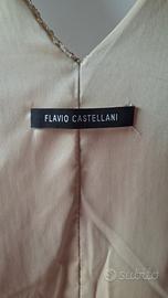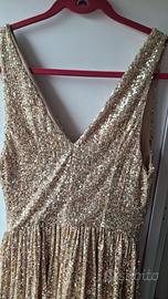 Firmato Flavio Castellani, mai usato. Paillettes oro, corto, cerniera lato, svasato nella lunghezza. Completamente foderato. Scollo a V davanti e dietro. Lunghezza 87 cm (la parte più lunga), larghezza vita 32. Prezzo pieno 450, acquistato a 180 euro.