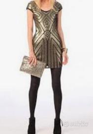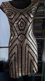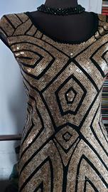 Labirinto della moda e galassie in questo strepitoso abito in paillettes oro scuro e tessuto nero elasticizzato stile art deco'. dietro e' tutto nero senza lampo.