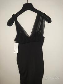 abito da sera(o party dress) smanicato, caratterizzato da un design a contrasto: un corpetto impreziosito da paillettes e una gonna aderente drappeggiata. Dettagli del Capo Design:Presenta uno scollo a V profondo sul davanti, accentuato da strati di mesh nero trasparente che si incrociano sopra una base di paillettes argentate. Punto Vita:È evidenziato da una fascia orizzontale ricamata con paillettes dorate/bronzo, che separa il corpetto dalla gonna. Gonna:Realizzata in tessuto elasticizzato nero (probabilmente jersey o crêpe), con una lavorazione a drappeggio laterale che conferisce una vestibilità aderente (bodycon).