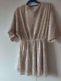 Abito shorts. Sotto ci sono i pantaloncini e sopra la gonna. In paillettes dorate. Lunghezza totale cm 80. Taglia S. Lunghezza maniche al gomito. Brand zhon made in Italy. Completamente foderato in tessuto elasticizzato. Mai utilizzato. ha solo due filini tirati nel punto vita Dove c'è l'elastico