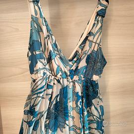 Abito senza maniche, con coprispalle e foulard. La gonna è particolare perché è fatta con più teli. Non è trasparente in quanto ha un interno di sottile maglina bianca.