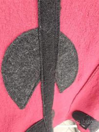 Questo abito smanicato in lana cotta color rosso fragola/bordeaux è un vero gioiello di stile. Caratterizzato da un design asimmetrico e applicazioni a contrasto nere che richiamano forme organiche e artistiche.